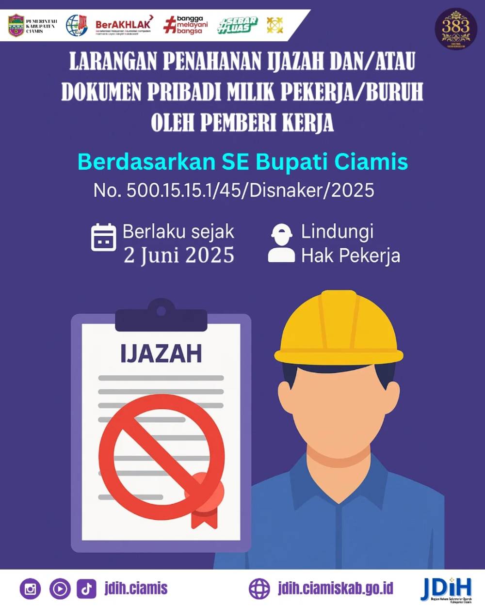 Surat Edaran Bupati Ciamis tentang Larangan Penahanan Ijazah dan/atau Dokumen Pribadi Milik Pekerja/Buruh Oleh Pemberi Kerja